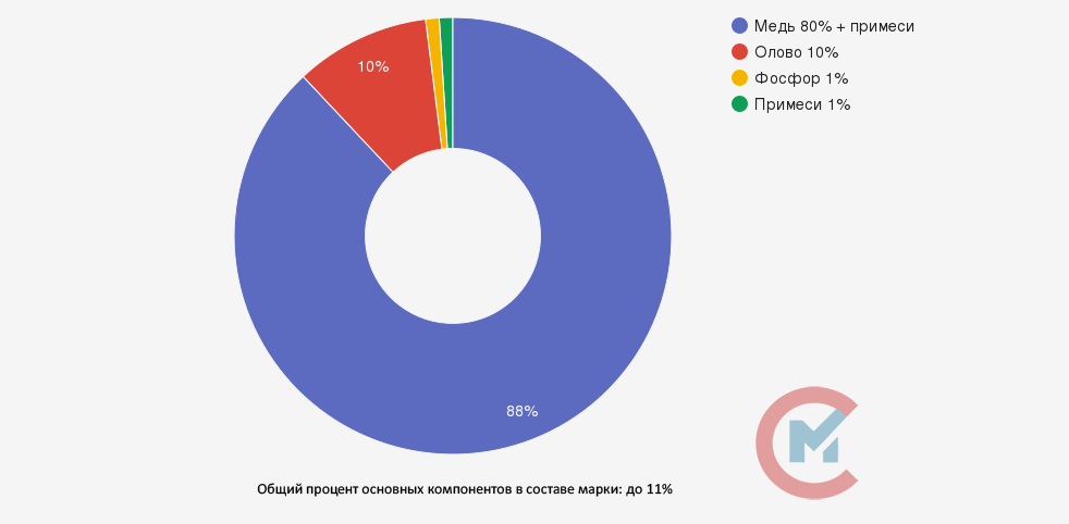 Химический состав этого сплава содержит в себе 10% олова и 1% фосфора, а основой является медь. При изготовлении данного сплава допускается добавление примесей, общей массой до 1%.