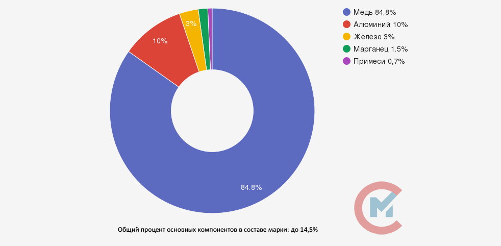 В состав основных компонентов бронзовой марки БРАЖМЦ10-3-1.5 входят: от 9 до 11% алюминия, 2-4% железа и марганца в количестве от 1 до 2%. Допускается добавление примесей, общая масса которых не должна превышать 0,7% от общего объема.