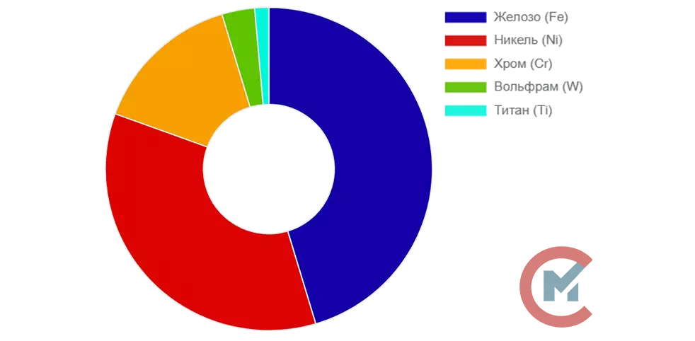 - Вольфрам (W) — примерно 3,5%, повышающий прочность материала при повышенных температурах.