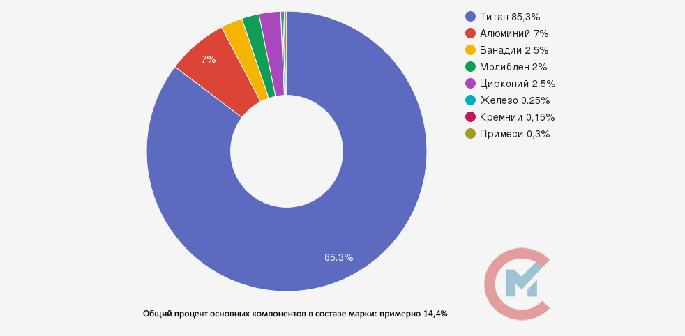 Содержание титана (Ti) в сплаве в процентном соотношении 84,938-91,7%, железа (Fe) до 0,3%, углерода (С) до 0,1%, кремния (Si) до 0,15%, молибдена (Mo) от 0,5% до 2%, ванадия (V) от 0,8% до 2,5%, азота (N) до 0,05%, алюминия (Al) от 5,5% до 7%, циркония (Zr) от 1,5% до 2,5%, кислорода (O) до 0,15% и водорода (H) до 0,012%.