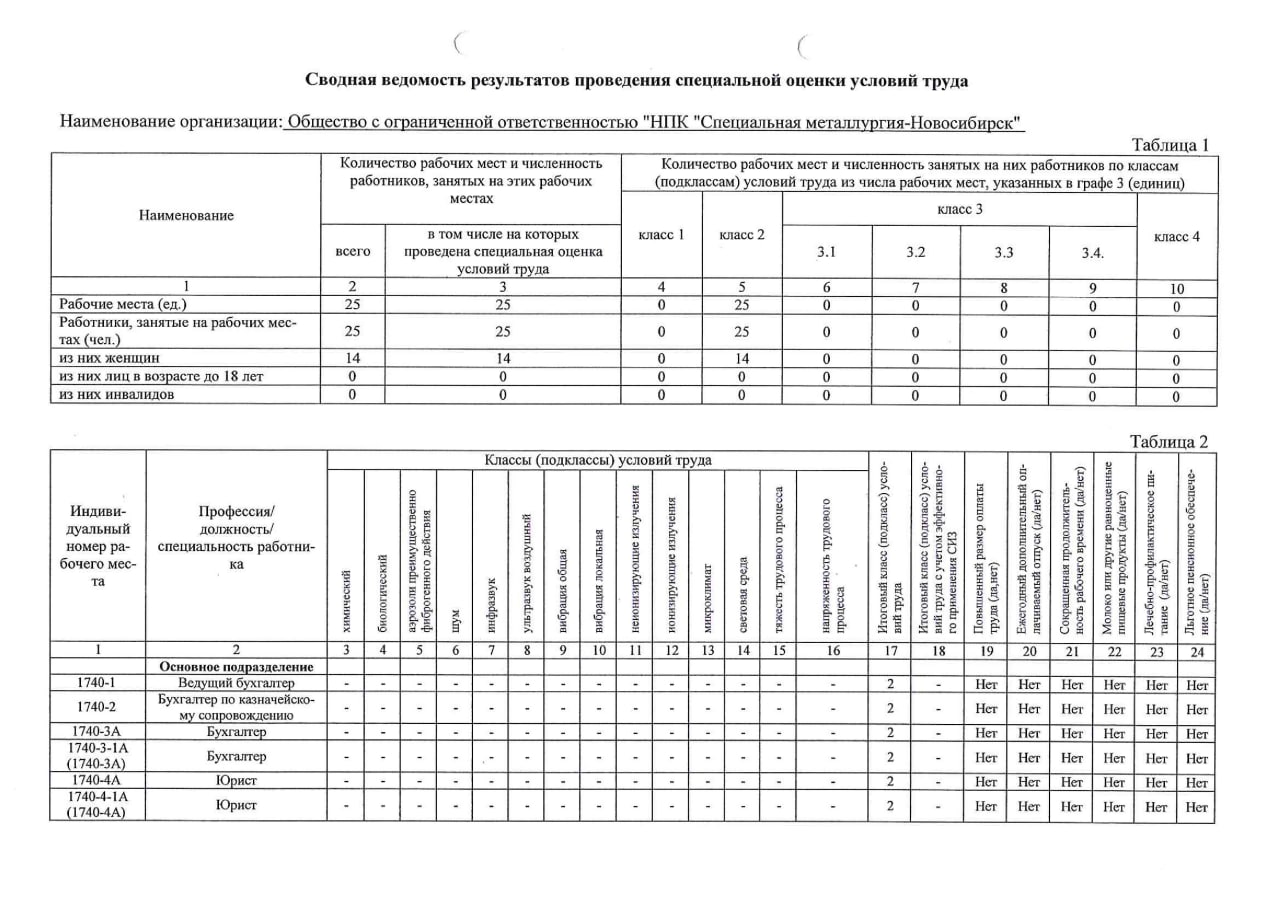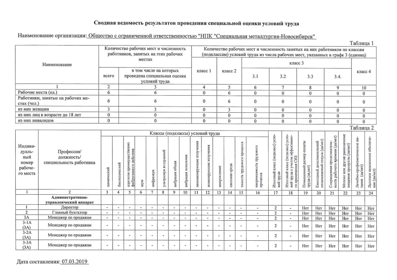 Согласно п.6 ст.15 Федерального закона от 28.12.2013 № 426-ФЗ публикуем сводные данные о результатах проведения специальной оценки условий труда в части установления классов (подклассов) условий труда на рабочих местах и перечня мероприятий по улучшению условий и охраны труда работников, на рабочих местах которых проводилась специальная оценка условий труда.
